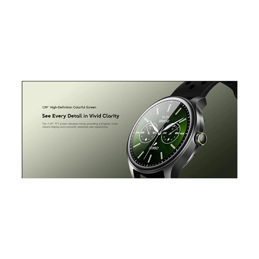 The Oraimo Watch 6R features a stylish round dial with a digital interface and a vivid 1.39-inch TFT full-touch color screen. Its anti-scratch Panda Glass ensures long-lasting clarity and protection, making it ideal for daily wear. Though the display resolution and Always-On feature are unmentioned, the Watch 6R offers a smooth, responsive experience thanks to its multitouch capability. With a single button and scrollable pin, navigation feels intuitive and user-friendly. Designed for comfort and durability, this Oraimo smartwatch blends modern aesthetics with practical usability, making it a standout choice for users who value both form and function.