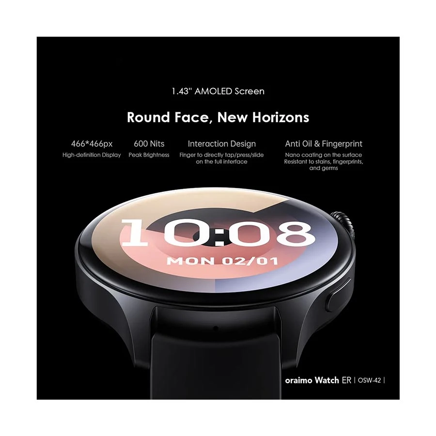 The Oraimo Watch ER Smartwatch comes with a 1.43-inch AMOLED display offering a sharp 466×466 pixel resolution and up to 600 nits brightness. The screen remains clear even under direct sunlight, making it easy to read notifications, health data, and workout stats at any time. AMOLED technology ensures vivid colors, deep blacks, and better power efficiency.