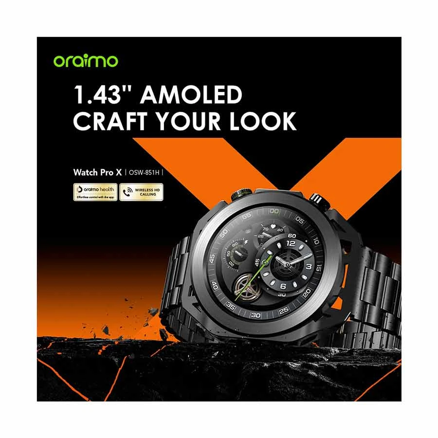 The Oraimo Watch Pro X is a premium smartwatch that combines style, practicality, and durability for consumers seeking a dependable companion for daily life and fitness tracking. The watch’s brilliant 1.43-inch AMOLED display with a clear 466*466 resolution provides beautiful visuals and smooth graphics, making notifications, messages, and fitness information easy to read at a glance. The Oraimo Watch Pro X OSW-851H features Bluetooth version 5.3, which offers a stable and seamless connection to your smartphone, allowing you to receive calls, texts, and app notifications without interruption. Its robust 350mAh lithium polymer battery enables up to 12 days of normal use on a single charge, with a standby duration of more than 30 days, allowing customers flexibility and convenience without the need for frequent recharging. The Oraimo Smart Watch recharges quickly as well, taking only around three hours to reach full battery capacity. The Oraimo Watch Pro X, made of a combination of ABS, PC, and aluminum alloy materials, has a sleek and sturdy design that is both lightweight and durable, able to handle daily wear and tear.